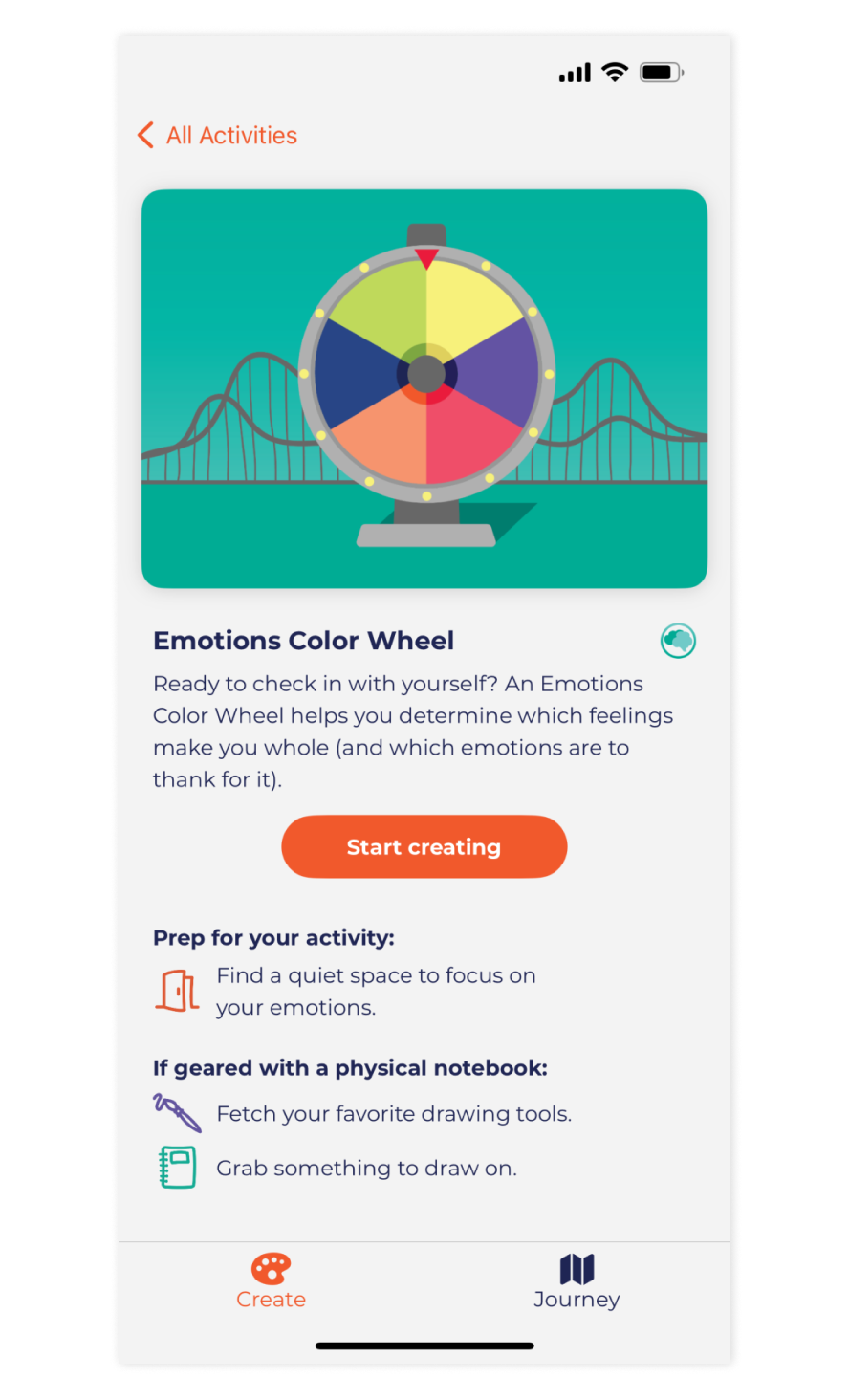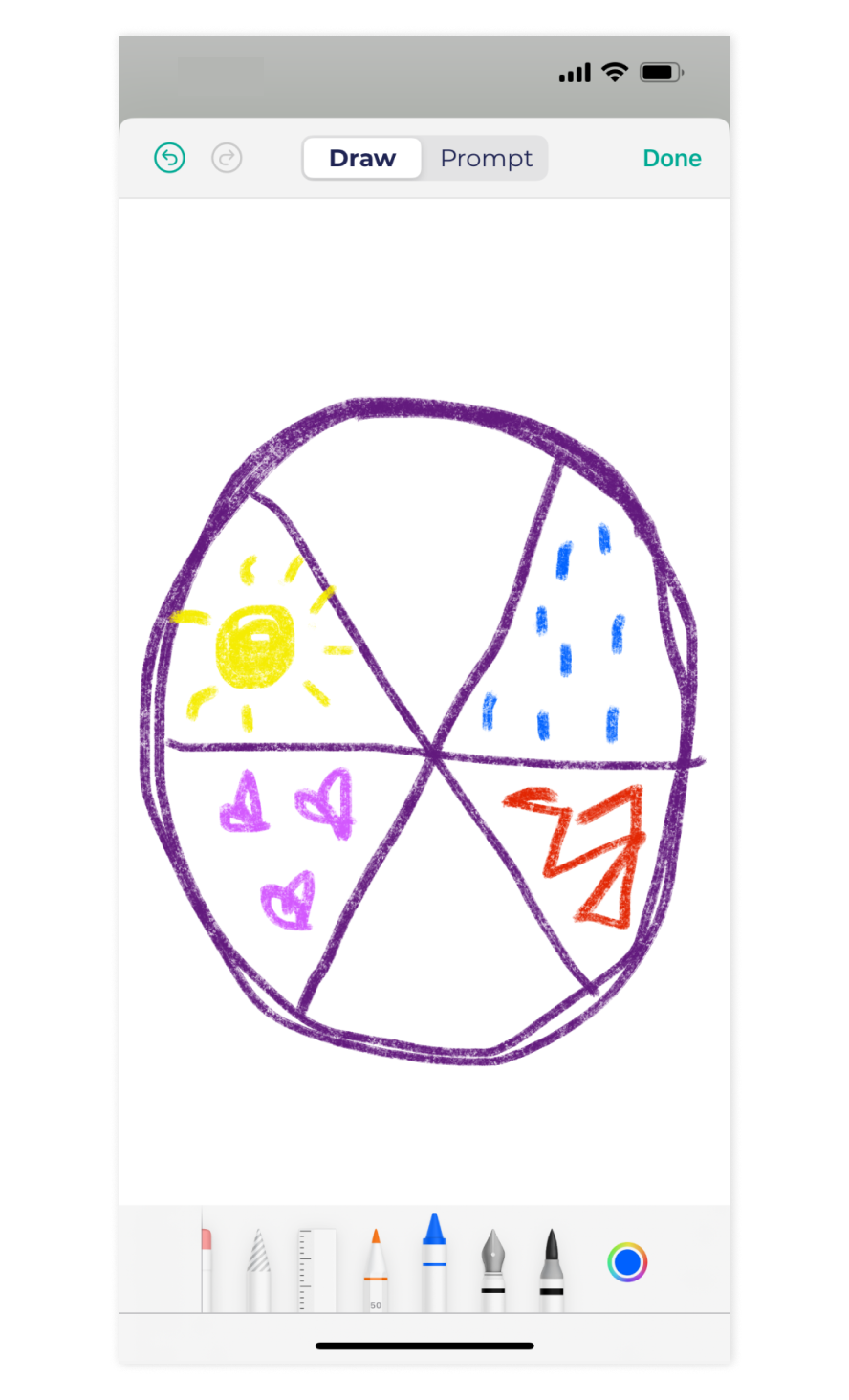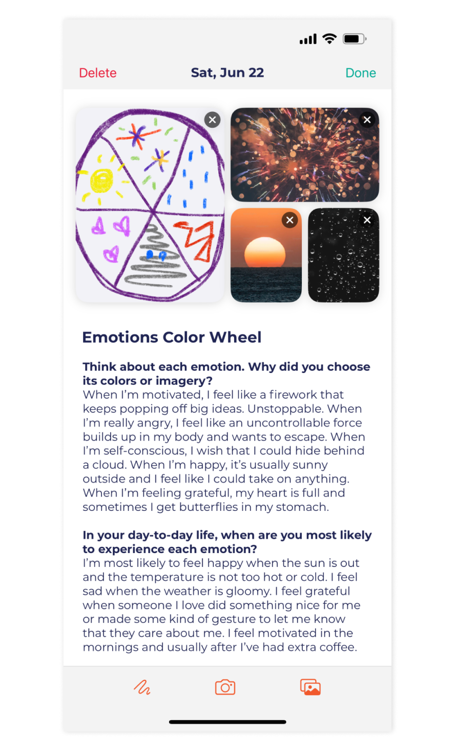 Follow the guided journaling prompts to reflect on what you drew and the emotions it evoked. Add more photos to your entry until it feels complete.
